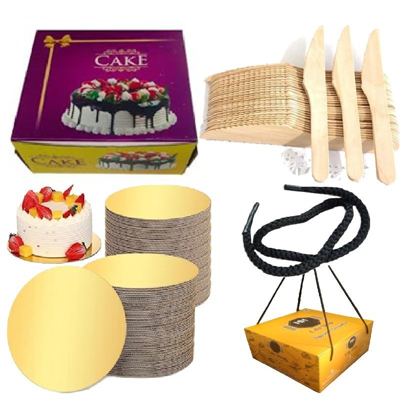 125 pcs set includes 25 Box, 25 Base, 50pcs Handle lace, 25 Wooden Knife. Box Size – 12x12x4 and base for 12” suitable for 2kg cake
