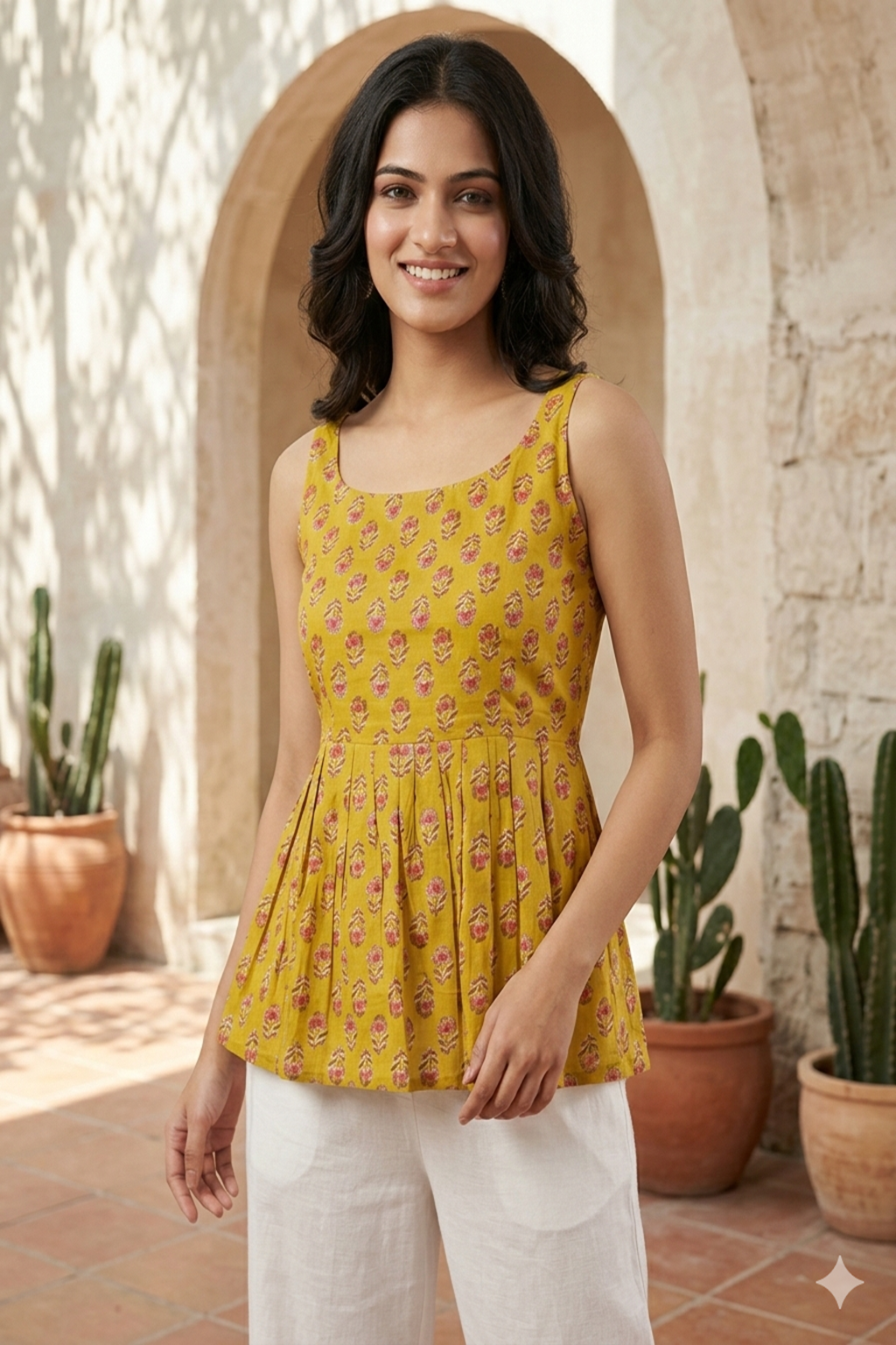 Upgrade your everyday wardrobe with this stylish sleeveless peplum top crafted from pure cotton. The breathable fabric keeps you comfortable even on warmer days, while the 26-inch length provides a flattering silhouette. The sleeveless design adds a modern touch, making it a versatile pick for casual outings, holidays, and daily wear. Pair it with your favorite jeans for an effortless look.