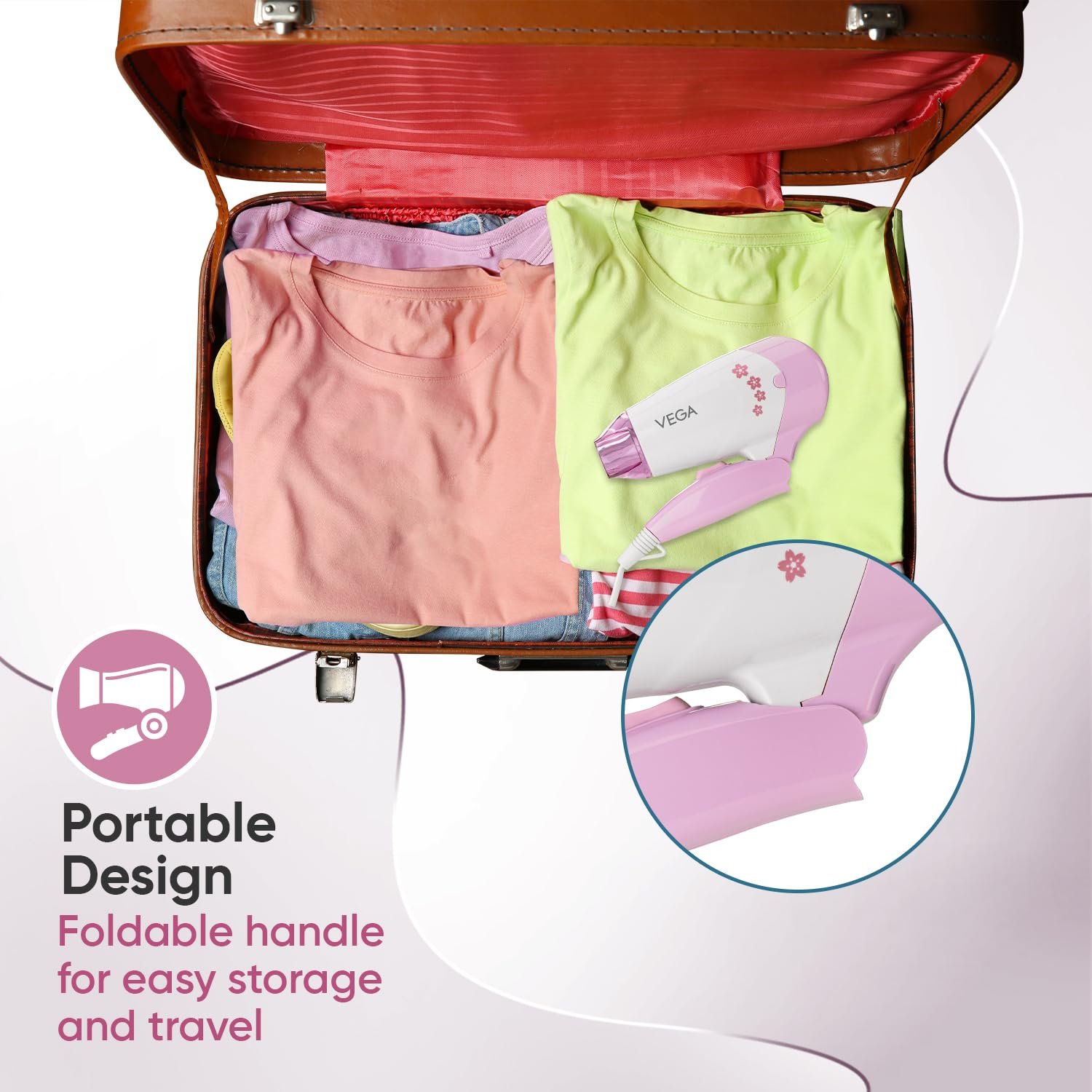 VEGA Insta Glam Foldable 1000-1200Watts Hair Dryer for Men & Women, 2 Heat & 1 Speed Settings (Low & High), Perfect Blow Dry & Style, Compact Hair Dryer for Travel & Home Use (VHDH-20) Made In India
