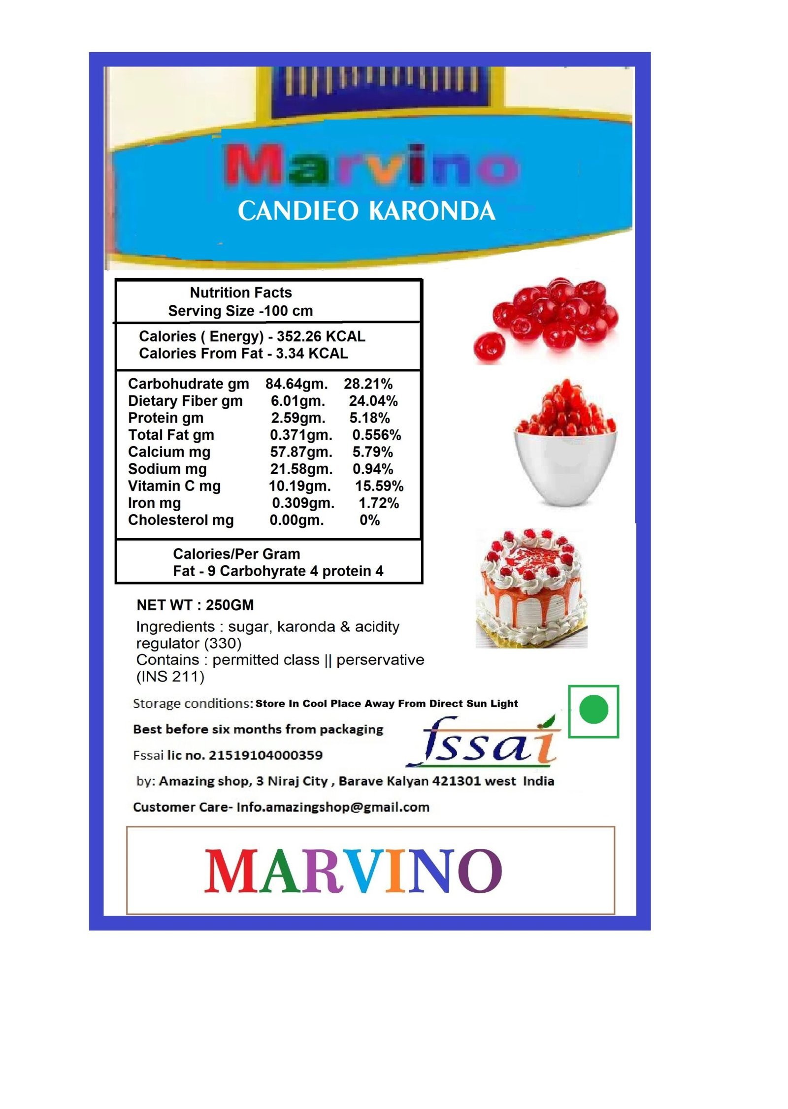 Marvino Karonda Cherry 250 gm For Cake Decoration