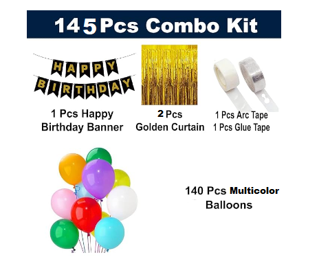Multicolor Balloons and Golden Foil Curtains Black Birthday Banner, Arc Strip Tape, Nano Glue Dot Tape(Combo Of 145)